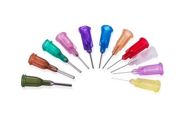 Puntas dispensadoras de acero inoxidable con buje de seguridad de polipropileno para un ajuste seguro a los depósitos del barril. Puntas de dispensado rápido punto a punto ideales para micropuntos, diseñadas para dispensar la mayoría de adhesivos y fluidos viscosos, pero no es adecuado para cianoacrilatos.